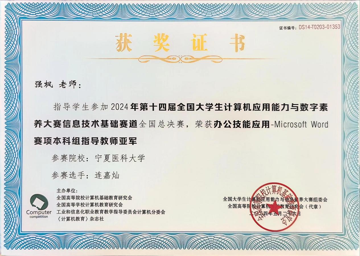近日,由全国高等院校计算机基础教育研究会、全国高等学校计算机教育研究会、工业和信息化职业教育教学指导委员会计算机分委会和《计算机教育》杂志社主办的2024年度第十四届全国大学生计算机应用能力与数字素养大赛胜利闭幕。太阳成在全国总决赛中表现出色,喜获佳绩,荣获团体一等奖2项,个人单项一等奖6项,二等奖4项,三等奖2项,学校荣获优秀组织奖,我院强枫老师指导的人文与管理学院2023级公共事业管理专业连嘉灿同学荣获文字处理赛项全国亚军。