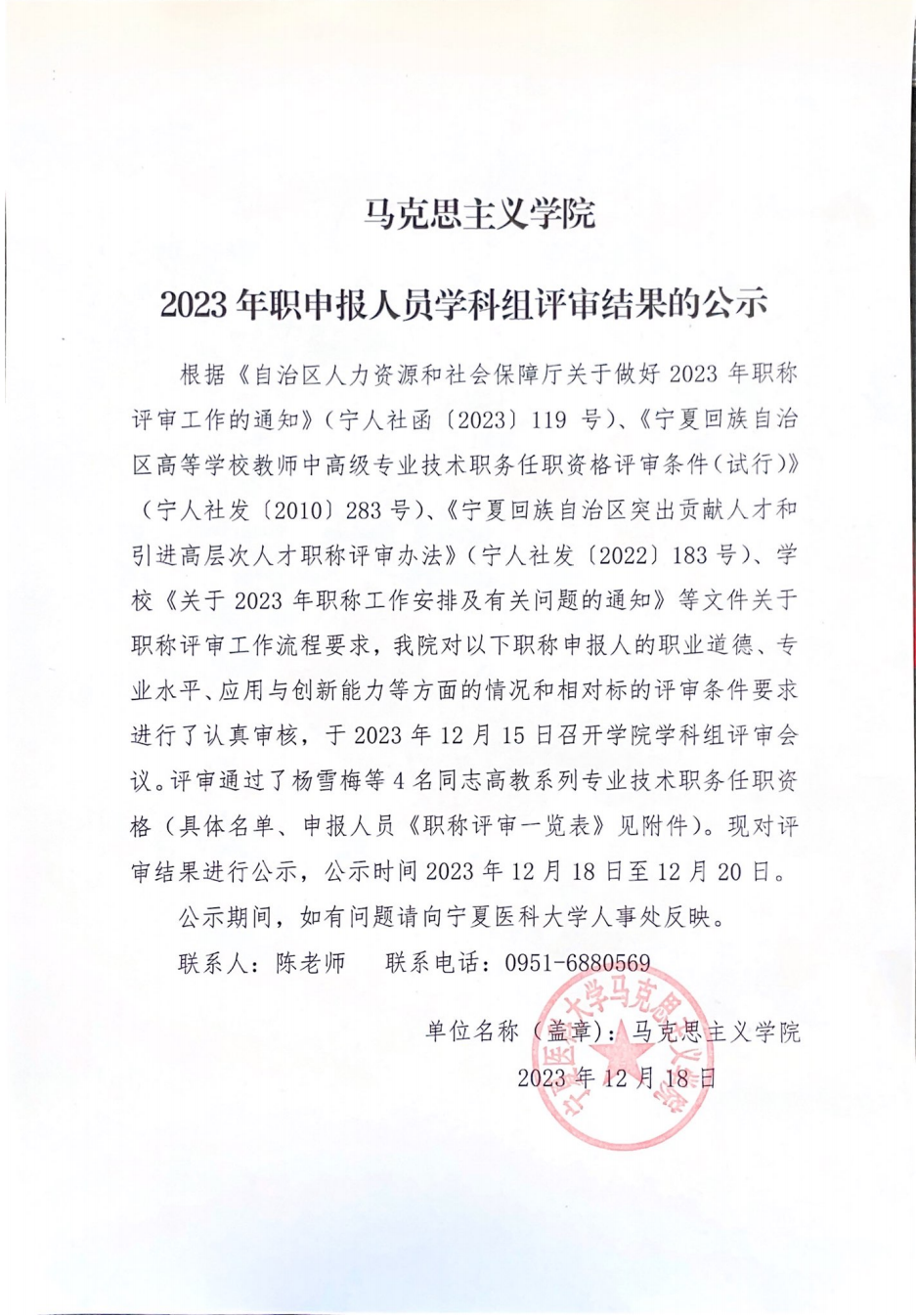 马克思主义学院2023年职称申报人员学科组评审结果的公示