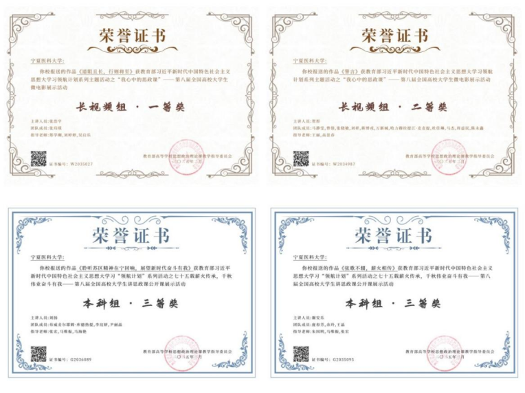获奖作品中,微电影《道阻且长,行则将至》荣获“我心中的思政课”长视频组全国一等奖,《誓言》获同组别全国二等奖;公开课作品《聆听苏区精神在宁回响,展望新时代奋斗有我》《弦歌不辍,薪火相传》均获“大学生讲思政课”公开课展示活动全国三等奖。这些成果既是马克思主义学院落实立德树人根本任务、推进思政课改革创新生动实践,更体现了宁医学子“讲好中国故事”的使命担当。