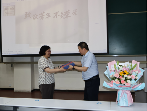 荣休仪式上,大家通过视频回顾了韩梅教授卓越的教育与工作履历,共同致敬这位教育路上的坚守者与引路人。教师发展与教学质量监控中心负责人为韩梅教授赠送荣休礼物,表达了对她辛勤奉献的感激与敬意;青年教师代表张少婷为韩梅教授献上鲜花,传递着青年一代对前辈的崇敬与祝福;本科生代表王月晴同学的发言,真挚表达了学生们对韩梅教授的感恩与不舍。