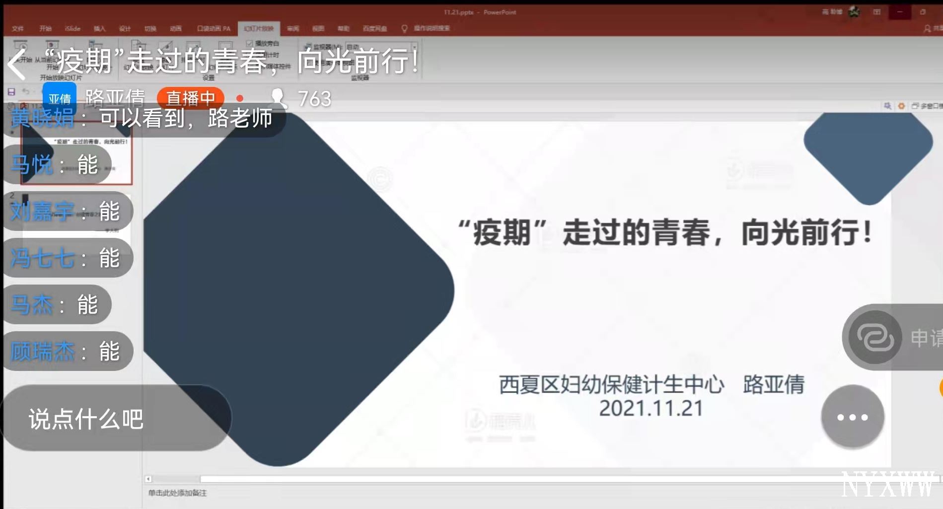 11月21日晚,护理学院特邀银川市西夏区妇幼保健计生中心路亚倩为学院各年级学生开展复工复学后疫情防控注意事项及择业就业心得分享线上专题讲座。学院党委副书记、全体辅导员与800余名学生一同线上聆听讲座。