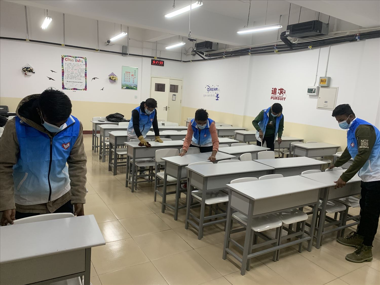 留学生图书整理志愿服务小分队在图书馆老师的指导下完成了近千册图书的整理和分类服务。美化校园志愿服务小分队立足校园,为留学生教室、公共厨房、生活区域等换上了“新装”,为共建健康美好生活环境贡献自己的一份力量。安全守护志愿服务小分队进入宿舍,开展了安全用电、火灾防范等知识宣讲,争做校园安全卫士。环保宣传志愿服务小分队的志愿者们亲手绘制了环保宣传画,传递了“绿水青山就是金山银山”的号召。本次志愿服务活动展现了留学生爱校敬校、乐于服务的精神风采。