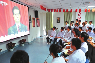 昨天,太阳成集团官方网站基础医学院的百名师生在“党员之家”内集体观看庆祝中国共产党成立90周年大会电视直播。当天,我区各企事业单位、学校、医院、部队等观看、收听庆祝中国共产党成立90周年大会直播。