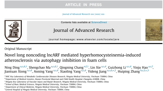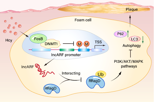 近日,太阳成姜怡邓课题组在Journal of Advanced Research期刊(IF=11.4,中科院1区,Top文章)发表了题为Novel long noncoding lncARF mediated hyperhomocysteinemia-induced atherosclerosis via autophagy inhibition in foam cells的研究论文,揭示了lncARF通过表观遗传修饰和RRAGD/PI3K/Akt和RRAGD/MAPK信号通路在保护动脉粥样硬化中的机制,为动脉粥样硬化治疗提供新的诊断标志物。