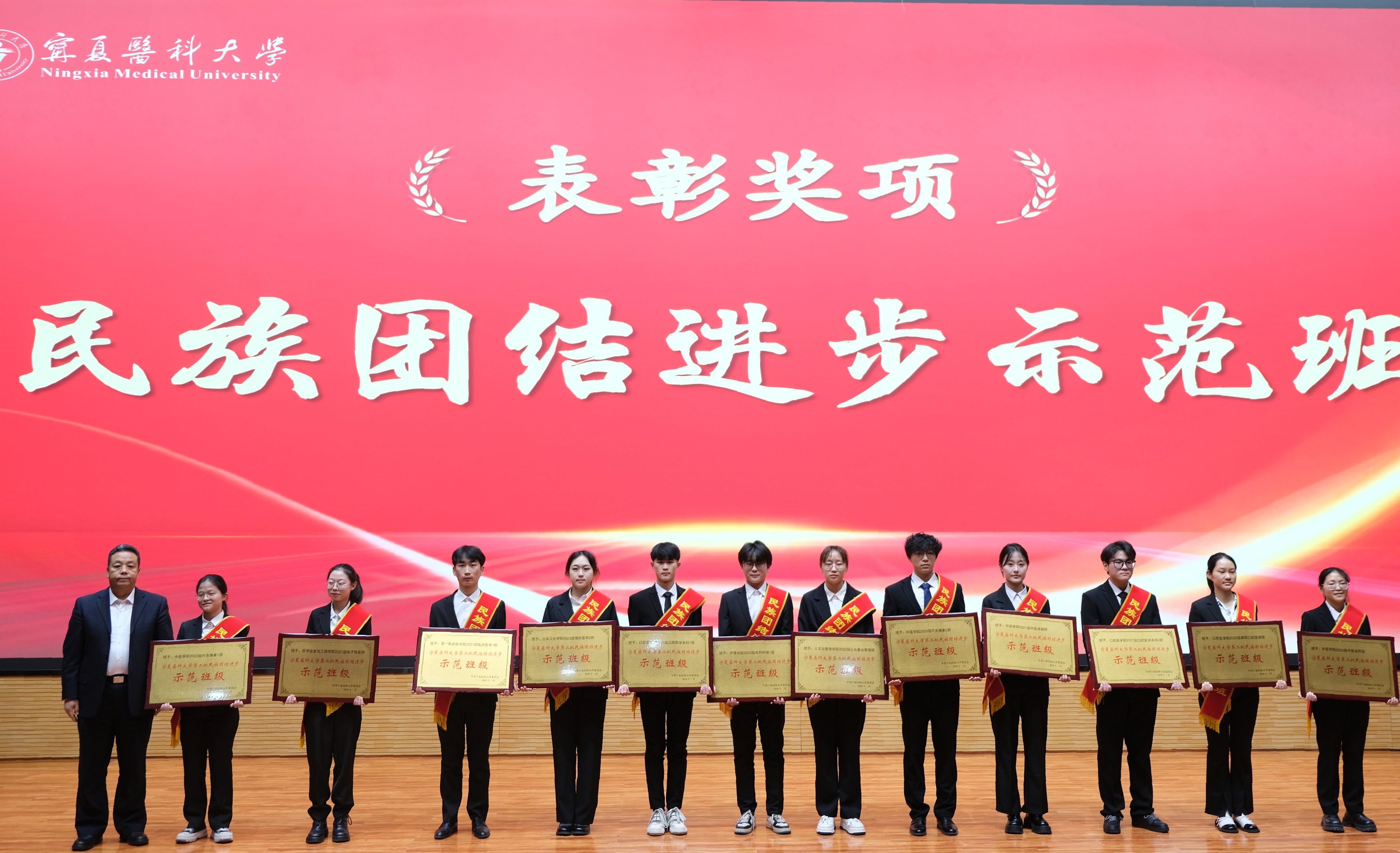 大会在庄严的国歌声中拉开帷幕,会议宣读了2023—2024学年获得各类奖学金、先进班集体、优秀个人的表彰决定和授予23个“民族团结进步示范班级”的通知。张治荣、姜怡邓和副校级领导分别为被授予“民族团结进步示范班”代表,先进班集体获奖代表,国家奖学金获奖代表、国家励志奖学金获奖代表,校长特别奖学金获奖代表,自治区来华留学生政府奖学金获奖代表,“三好学生标兵”、“三好学生”获奖代表和优秀学生干部获奖代表颁发奖牌、荣誉证书。