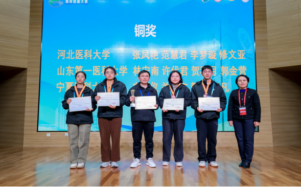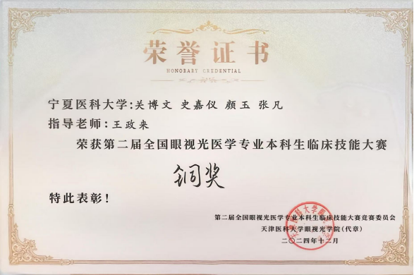 12月28日,由国家教育部眼视光医学教学指导分委员会主办,天津医科大学、天津医科大学眼科医院承办的“第二届全国眼视光医业本科生临床技能大赛”圆满落幕。由学校第三临床医学院2021级眼视光医学专业关博文、史嘉仪、颜玉、张凡4名学生组成的团队荣获第二届全国眼视光医学专业本科生临床技能大赛铜奖。