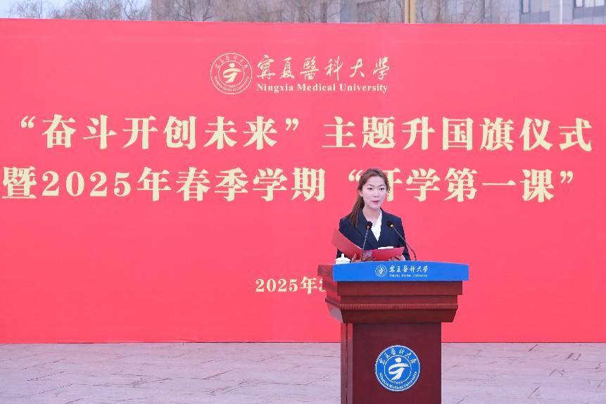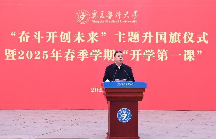 张治荣以《奋斗开创未来》为题讲授“开学第一课”,鼓励同学们以坚定的理想信念为指引,以饱满的学习热情为动力,以昂扬的奋斗姿态为支撑,铸牢中华民族共同体意识,争做爱国奉献、开拓进取、挺膺担当、民族团结的奋斗者,为实现中华民族伟大复兴的中国梦贡献青春力量。他勉励同学们要坚定文化自信,做爱国奉献的奋斗者。涵养家国情怀,以“匠心独运”的执着解析生命密码,以“救死扶伤”的信念守护人民健康,以“和合共生”的胸襟推动中西医对话,传承好中华优秀传统文化。要坚持守正创新,做开拓进取的奋斗者。满怀信心、敢为人先、勤耕不辍,把论文写在实验室的深夜灯火里,镌刻在攻克“卡脖子”技术的征程中,用智慧改写科技版图。要勇于踔厉奋发,做挺膺担当的奋斗者。践行宁医人“健康所系,性命相托”的誓言,以“大医精诚”的姿态,在祖国最需要处挺起脊梁。要携手同心共筑,做民族团结的奋斗者。全体师生要深刻认识铸牢中华民族共同体意识的重大意义,始终将“中华民族一家亲”的信念融入血脉,像石榴籽一样紧紧抱在一起,在构建中华民族共有精神家园中书写“美美与共”的时代答卷。
