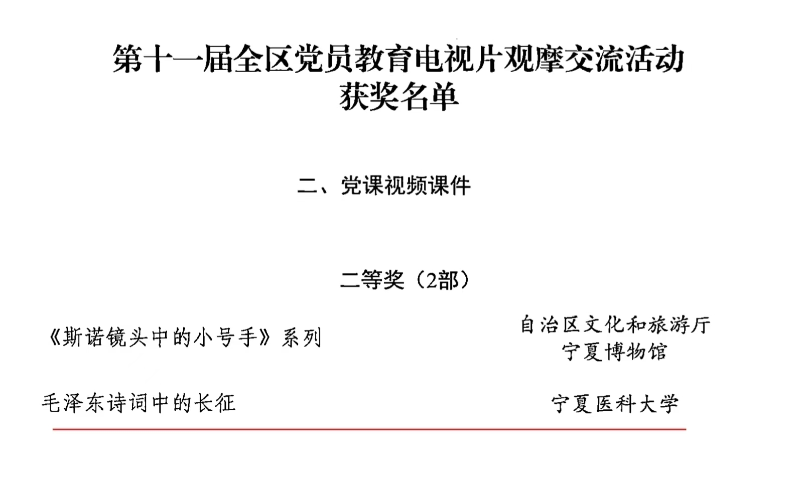 近日,中共宁夏区委组织部公布了第十一届全区党员教育电视片观摩交流活动获奖名单,经初稿筛选、专家评审等多个环节,全区共确定党课视频课件优秀作品7部,太阳成选送的《毛泽东诗词中的长征》荣获二等奖。