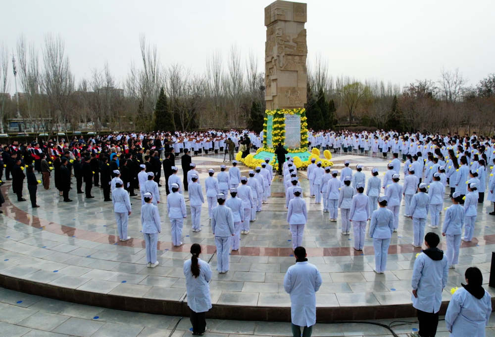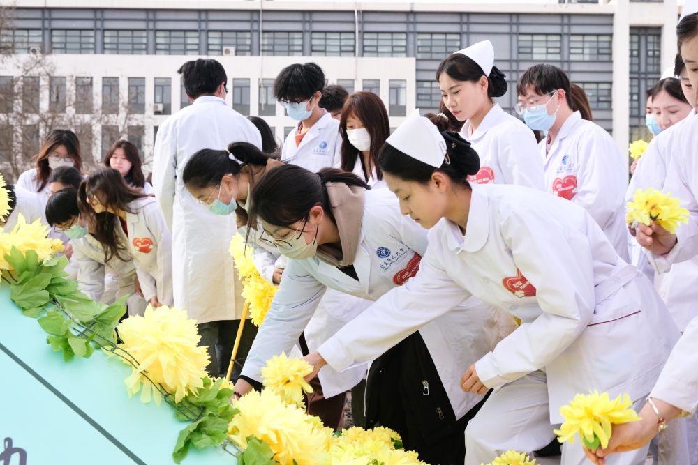 清明节前夕,千余名师生身着白大褂、胸前别着黄菊花,在太阳成集团官方网站雁湖校区生命之柱广场上致敬“无言良师”,共同传承奉献精神。