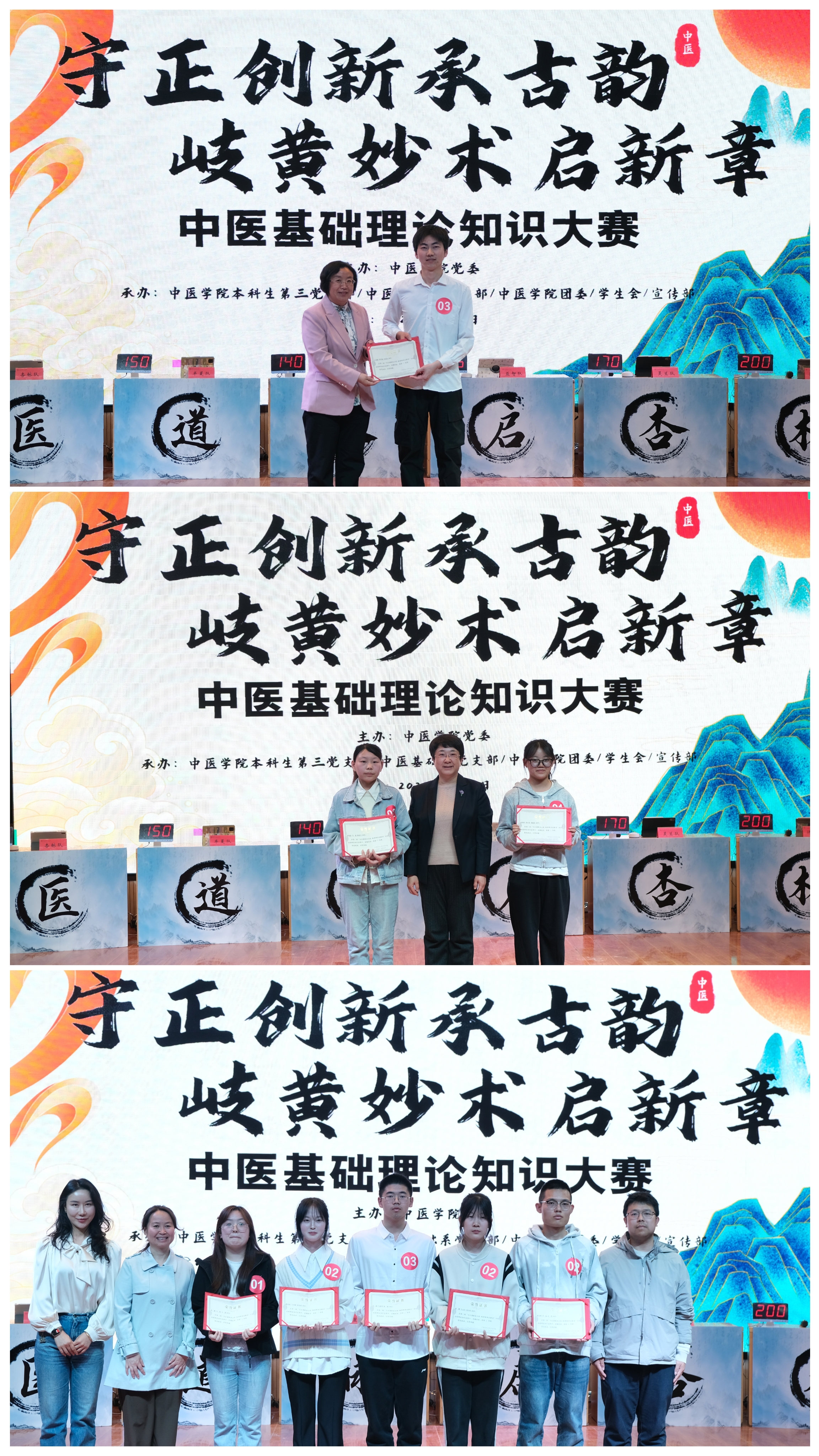 在第三届中医基础知识竞赛决赛现场,来自学校中医学院的8支队伍24名参赛选手从阴阳五行到藏象经络,从四诊合参到辨证论治,从草药功效再到经方应用,将中医基础知识融会贯通,沉稳作答、竞逐魁首。最终,济川队荣获一等奖,灵兰队、茯苓队荣获二等奖,苁蓉队、杏林队、益智队、半夏队、南星队荣获三等奖。