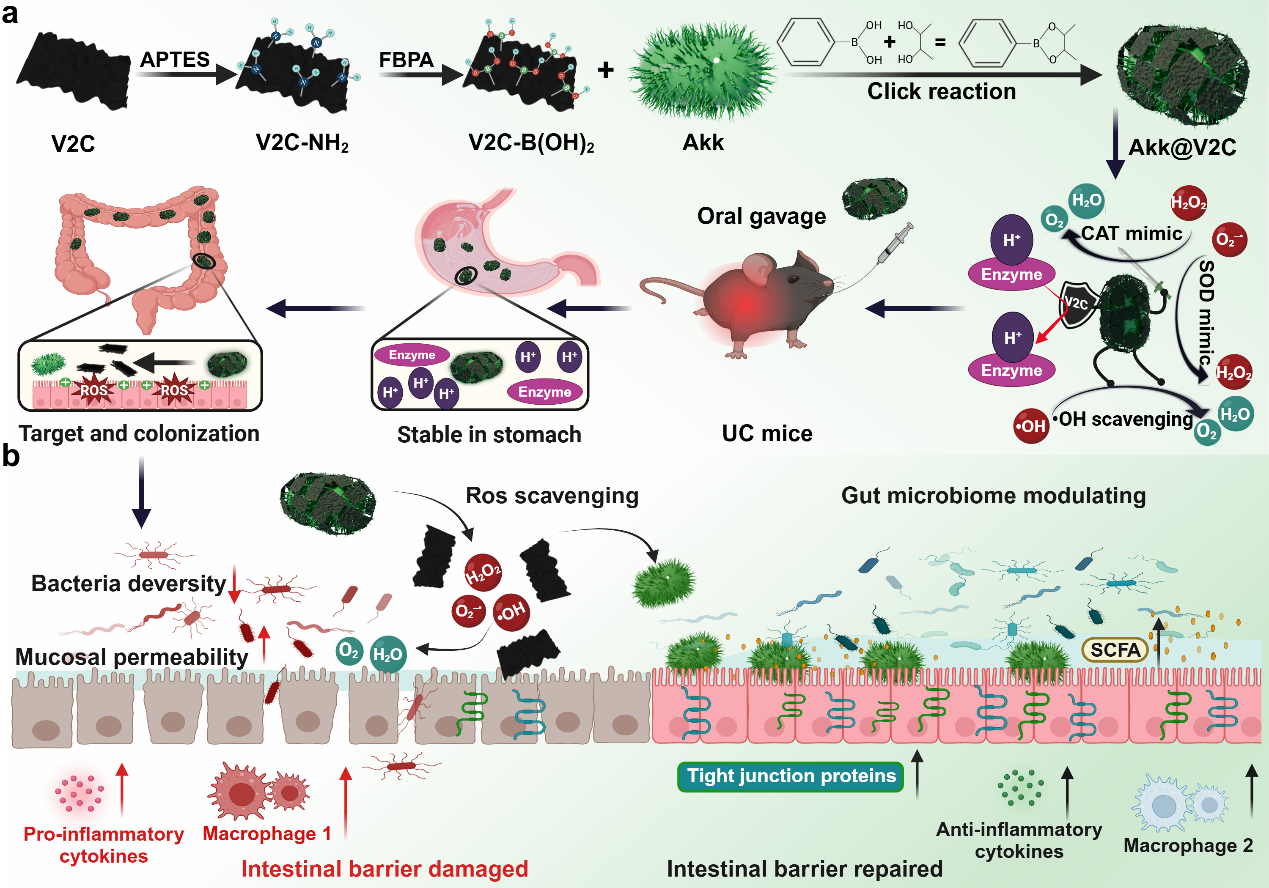 溃疡性结肠炎(UC)引发的肠道微环境紊乱主要表现为菌群失调和过量活性氧积聚。尽管微生态制剂在恢复肠道稳态方面具有潜力,但其疗效常受限于胃肠道恶劣环境及病灶部位的高活性氧水平。为此,本研究开发了一种以碳化钒(V2C) MXenzyme二维材料“武装”的嗜黏蛋白阿克曼菌(Akk)口服靶向递送系统(Akk@V2C)。研究结果表明,Akk@V2C对模拟胃肠道环境及高活性氧水平具有良好耐受性;在小鼠模型及UC患者结肠活检组织中具有良好靶向作用;通过清除活性氧、调控巨噬细胞极化、改善肠道屏障功能发挥调节肠道氧化还原及菌群稳态。本研究使用的表面修饰方法对益生菌活性无明显影响,具有拓展至其他益生菌的潜力。凭借优异的生物相容性和设计灵活性,该单细胞表面修饰技术为益生菌和生物材料的口服递送提供了新思路。