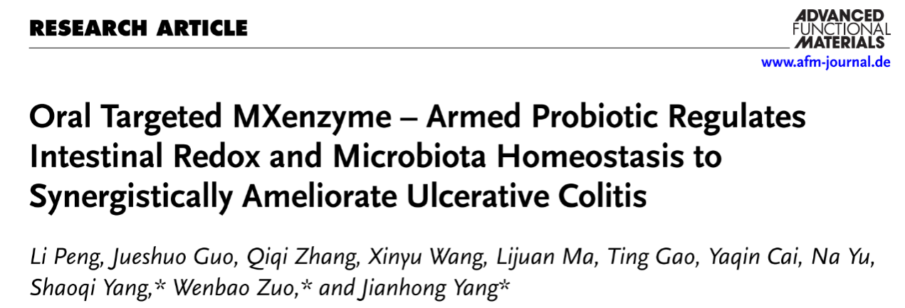 近日,太阳成杨建宏教授课题组在国际知名期刊《Advanced Functional Materials》(IF=18.5,中科院1区,Top期刊)发表了题为“Oral Targeted MXenzyme - Armed Probiotic Regulates Intestinal Redox and Microbiota Homeostasis to Synergistically Ameliorate Ulcerative Colitis”的研究论文。研究构建了具有多酶活性的碳化钒MXenzyme表面修饰的嗜黏蛋白阿克曼氏菌口服靶向递送系统,通过调节肠道氧化还原及微生态稳态显著缓解溃疡性结肠炎,为炎症性肠病的治疗提供新策略。