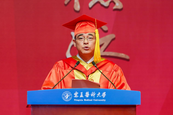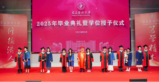 典礼上,宣读了2025届毕业生学历、学位授予情况以及2025年校级优秀毕业生表彰决定。在热烈的掌声中,学校领导先后为本科毕业生代表、研究生毕业生代表和校级优秀毕业生代表颁发毕业证书和学位证书,这一张张证书承载着毕业生们多年的努力与汗水,也标志着他们人生新征程的开启。宁夏国龙慈善基金会执行理事长兼秘书长董旭辉为获得“国龙奖学金”的2025届研究生颁奖,激励同学们在医学道路上不断拼搏进取,做出自己的贡献。