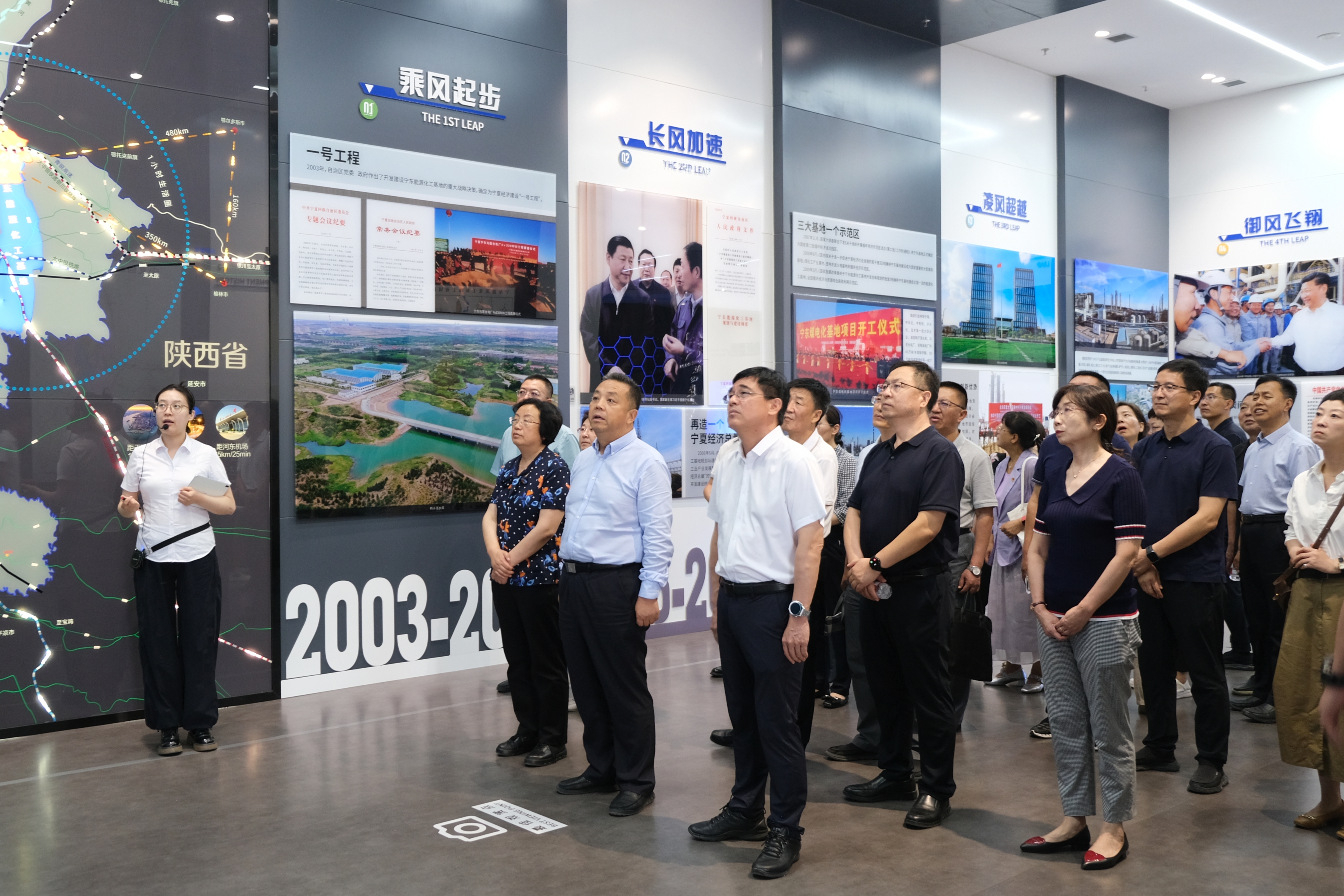 在科创宁东展厅,参观学习了“壮志凌云·山河逐梦”“凝心聚力·宏图筑梦”“战略引领·智慧造梦”“不忘初心·奋斗圆梦”四个篇章的展示内容,通过观看大量翔实的照片影像、历史资料、实物模型,详细了解宁东能源化工基地建设发展历程、煤制油项目情况以及在新能源、新材料等领域取得的科技创新成果。