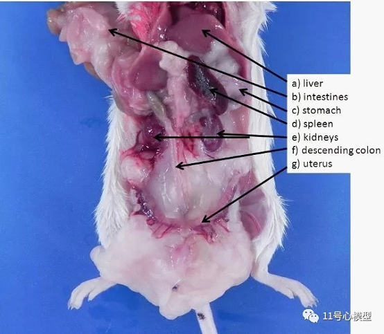 图2. 小鼠腹部和腹膜后器官。将肠和肝脏抬起并移动(或移除),可以看到以下器官。 a)肝脏,b)肠,c)胃,d)脾脏,e)肾脏,f)降结肠,g)子宫。