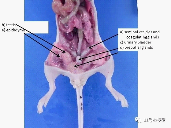 图3. 雄性生殖器官。 a)精囊和凝固腺体,b)睾丸(从阴囊通过腹股沟环推入腹腔,在小鼠和大鼠中保持开放),c)膀胱,d)包皮腺,e)附睾。