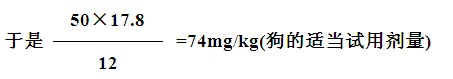见表2,12kg狗的体表面积为200g大白鼠的17.8倍。该药大白鼠的剂量为250mg/kg,200g的大白鼠需给药250×0.2=50mg。