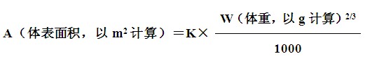式中的K为一常数,随动物种类而不同:小白鼠和大白鼠9.1、豚鼠9.8、家兔10.1、猫9.8、狗11.2、猴11.8、人10.6(上列K值各家报导略有出入)。应当指出,这样计算出来的表面积还是一种粗略的估计值,不一定完全符合于每个动物的实测数值。