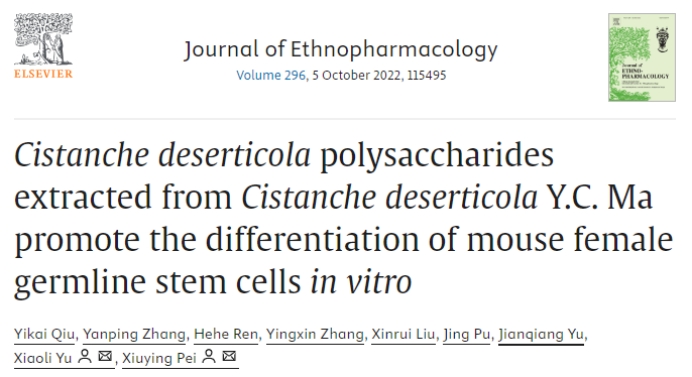 邱意开和裴秀英等人在《Journal of Ethnopharmacolodgy》上发表题为“Cistanche deserticola polysaccharides extracted from Cistanche deserticola Y. C. Ma promote the differentiation of mouse female germline stem cells in vitro”的论文。