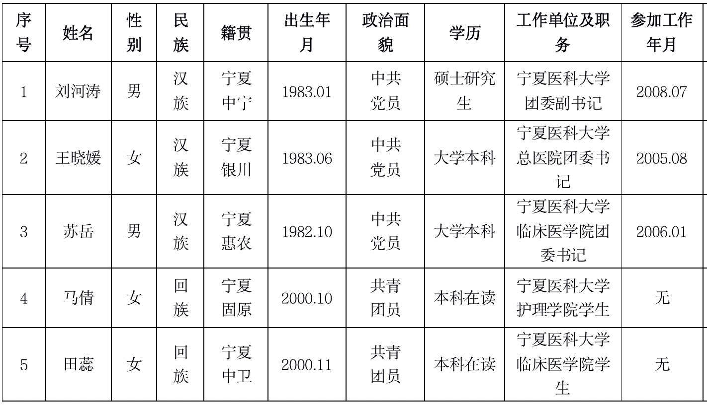 根据自治区团委《关于做好共青团宁夏回族自治区第十三次代表大会代表推选工作的通知》(宁团发〔2023〕1号)要求,经提名推荐、会议研究、组织考察,并报学校党委和区团委同意,推荐刘河涛等5名同志作为太阳成集团官方网站参加自治区第十三次团代会代表候选人初步人选,现予以公示。