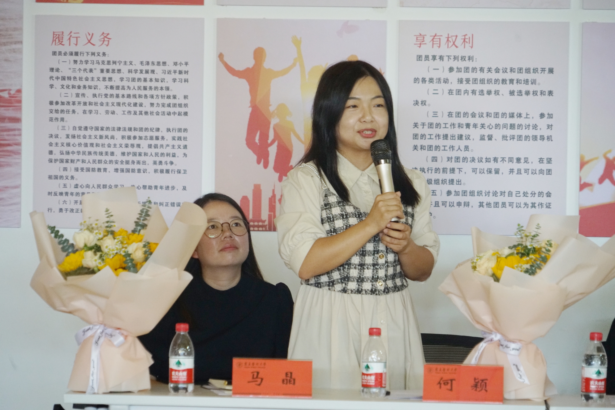 一段《百年大先生》的视频拉开了座谈会的序幕,教师代表马晶表示“宁医精神需要一代代师生赓续传承。”随后,九位学生代表从个人性格、授课风格、科研态度等方面依次向观众介绍此次获得荣誉称号的9位青年教师,并向老师赠送鲜花。