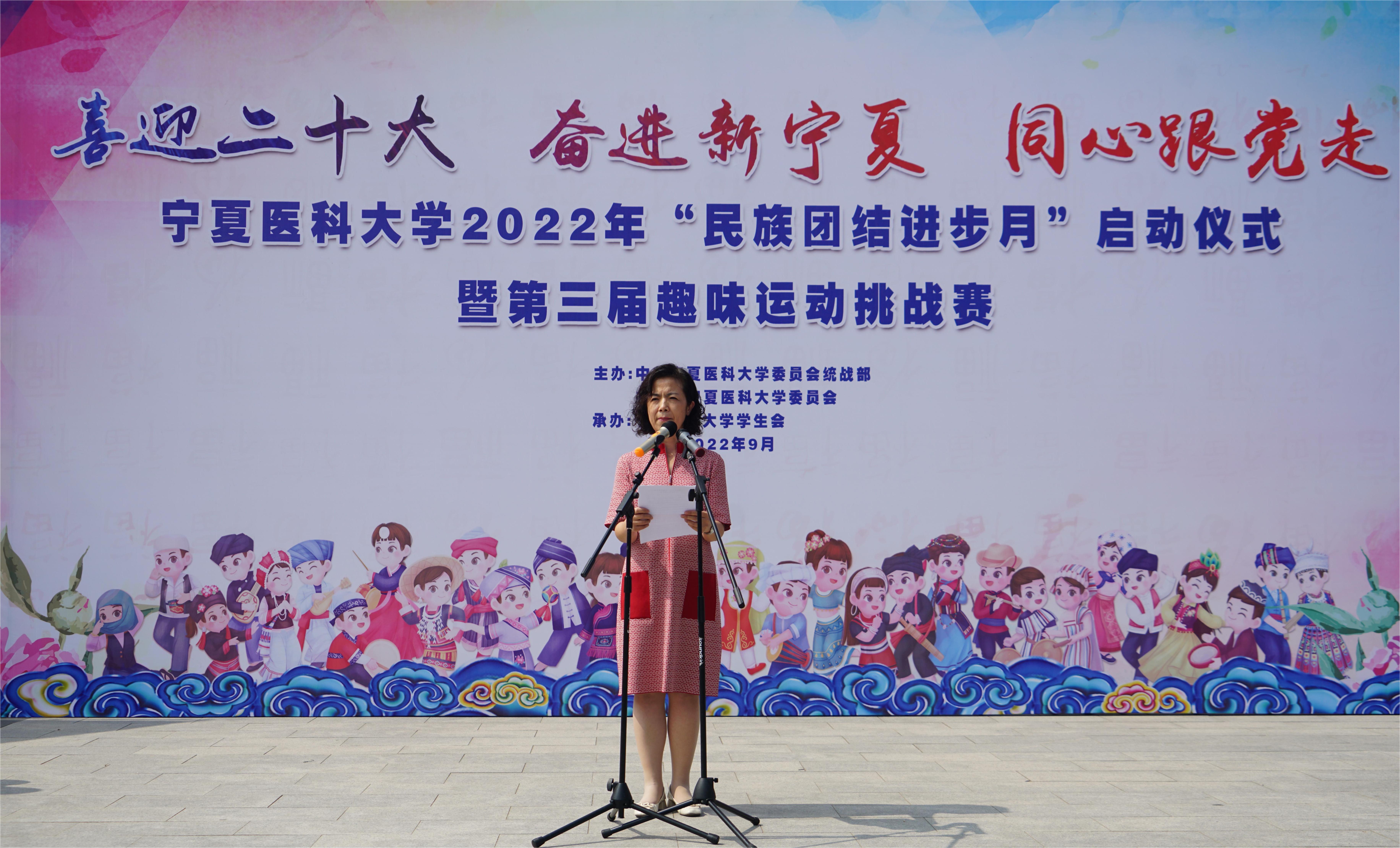 为深入学习宣传贯彻习近平总书记视察宁夏重要讲话和重要指示批示精神,认真落实自治区第十三次党代会精神,以铸牢中华民族共同体意识为主线,加强各民族交往交流交融,团结一心、共同奋斗,以实际行动迎接党的二十大胜利召开。2022年9月15日中午由学校党委统战部、团委联合主办、校学生会承办的“喜迎二十大 奋进新宁夏 同心跟党走”太阳成集团官方网站2022年“民族团结进步月”启动仪式暨第三届趣味运动挑战赛在雁湖校区尚德广场举行。学校党委常委、副校长刘志宏,各基层党团组织负责人及学生代表共计400余名师生参加了此次活动。