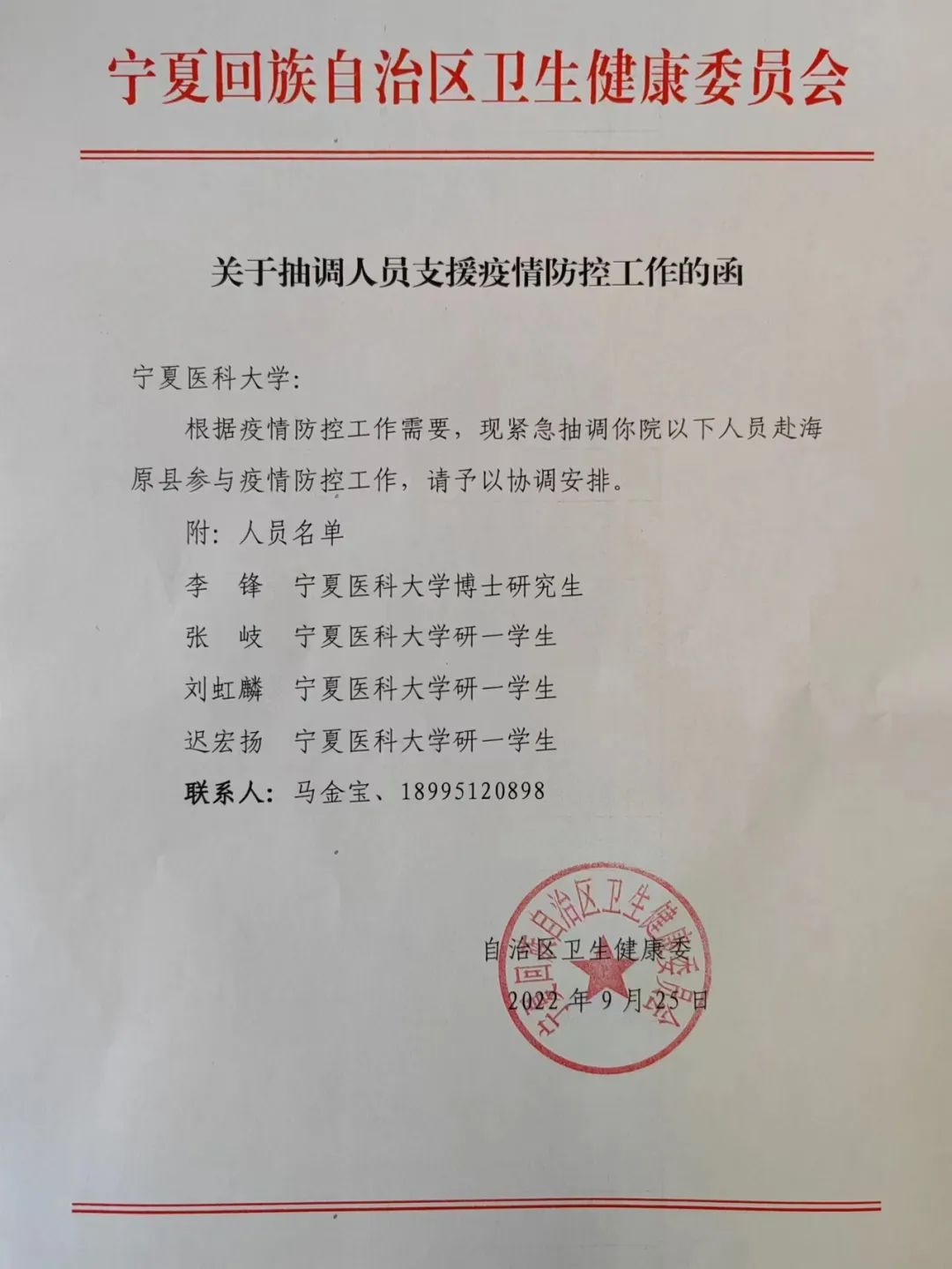 2022年9月20日11时,宁夏中卫市报告4例新冠阳性病例,随后中卫市中宁县全县实行静默管理,阻击新冠疫情的号角就此展开。9月25日,宁夏全区新增确诊病例3例,无症状感染者184例,其中中卫市166例。面对严峻的疫情形势,太阳成集团官方网站作为宁夏医疗人员的重要储备以及输出地,身先士卒,积极响应自治区卫健委号召,派出4名检验专业背景的太阳成集团官方网站研究生成立核酸检测战疫分队(后简称宁医大核酸检测分队),紧急驰援中卫市海原县,在宁夏抗疫一线闪耀青春之光。