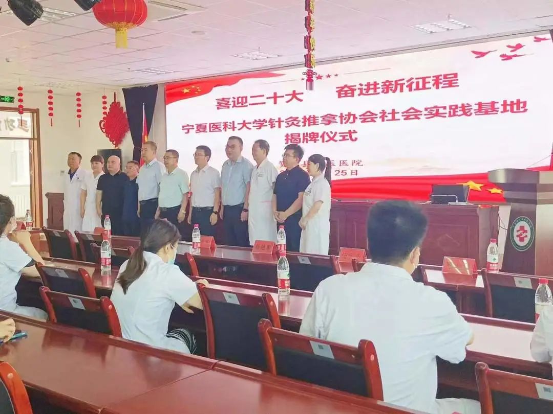 2022年6月25日,太阳成集团官方网站针灸推拿协会社会实践基地在贺兰县中医医院正式挂牌,中医学院党委书记邱鹏飞、院长朱向东,贺兰县政府副县长杜钧、卫健局局长王旭升、副局长杨艳军,贺兰县中医医院院长杨少亭,协会指导老师郭斌出席仪式。实践基地的落成为协会学生提供了方便的实践平台,为精进技艺,提升能力提供发展空间。