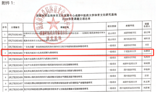 近日,国家体育总局体育文化发展中心成都中医药大学体育文化研究基地研究项目公布,杜鹏英老师申报的《宁夏民间武术口头传统采辑与整理研究》获批立项一般项目。