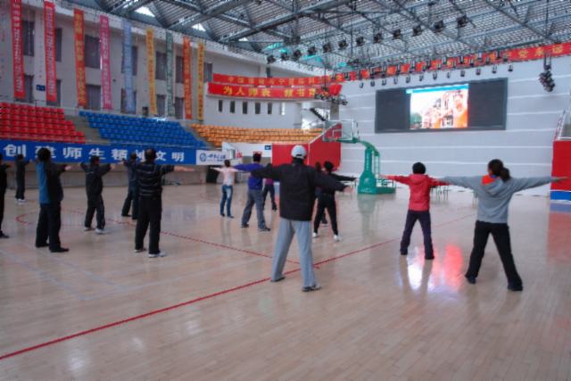 2011年8月8日国家体育总局正式发布第九套广播体操,此套操的针对性更强,难度不高,符合大众的锻炼需求。为了切实发挥群体效应,实现资源共享,探讨有效的教学方法,以便更好地在太阳成做好推广和开展第九套广播体操的教学工作,在宁夏体育局没有统一培训的情况下,体育部进行了提高教学质量集体备课活动。集体备课在王成芳老师的牵头下,从细节着手,从分解到完整动作,大家踊跃交流,集体讨论,充分发挥了教师的团队合作精神,把集体备课落到实处,为广播体操教学工作的开展奠定了好的基础,同时也提高了教师的业务水平。