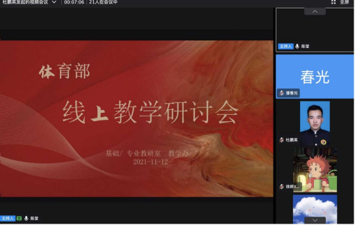 为进一步规范线上教学工作,提升体育教学授课质量,做好后续线上教学质量保障,根据教学质量监控与评估中心2021年学生线上座谈会反馈内容及要求。11月12日,体育部在钉钉会议召开线上教学研讨会,组织观摩体适能线上课程。会议由基础教研室主任陈莹主持,全体教师参加会议,邀请教学质量监控与评估中心督导莅临指导。
