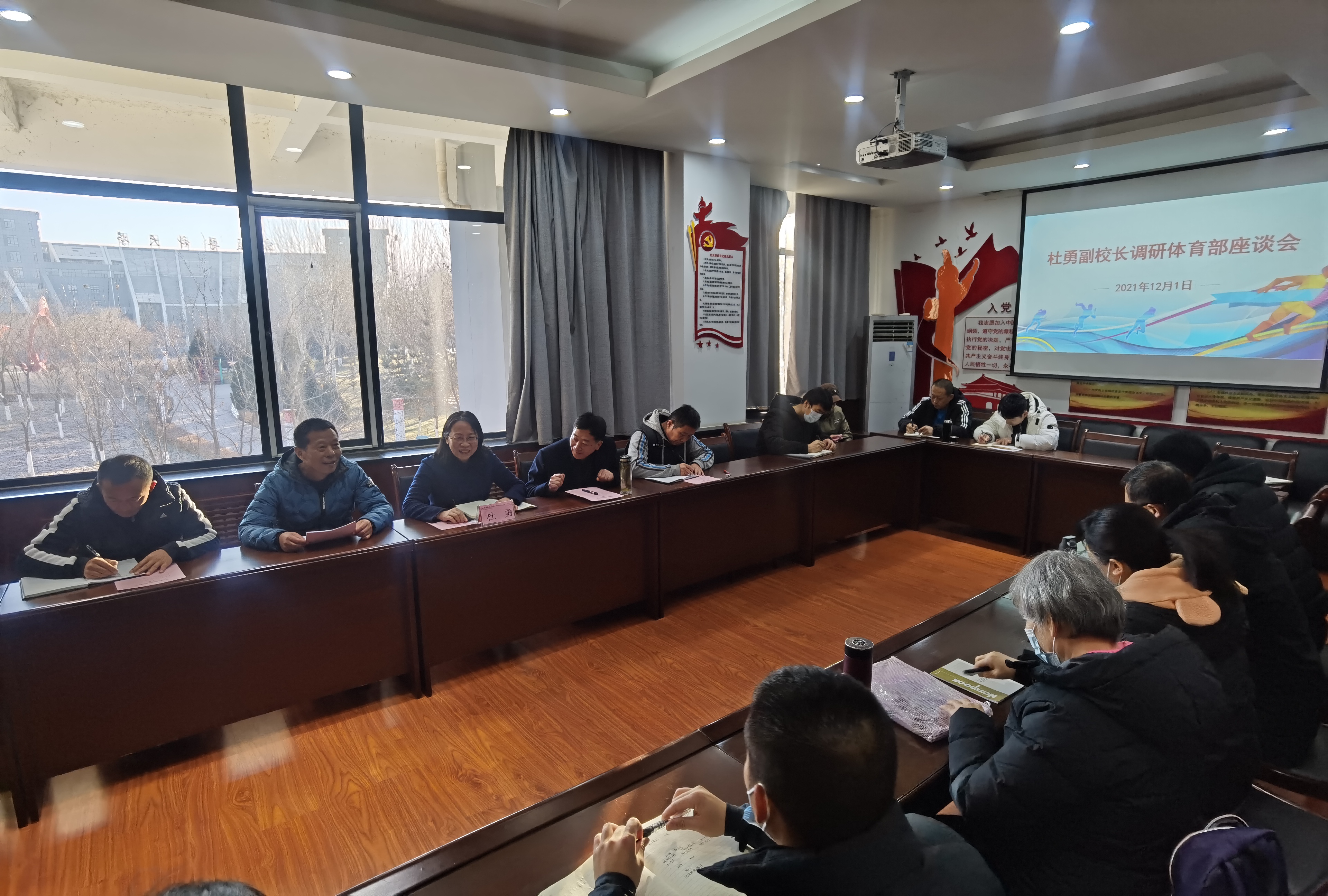 12月1日上午,体育部分管副校长杜勇在弘毅体育馆党员之家,与体育部全体教职工开展调研,体育部党总支书记雷鸣选主持会议。