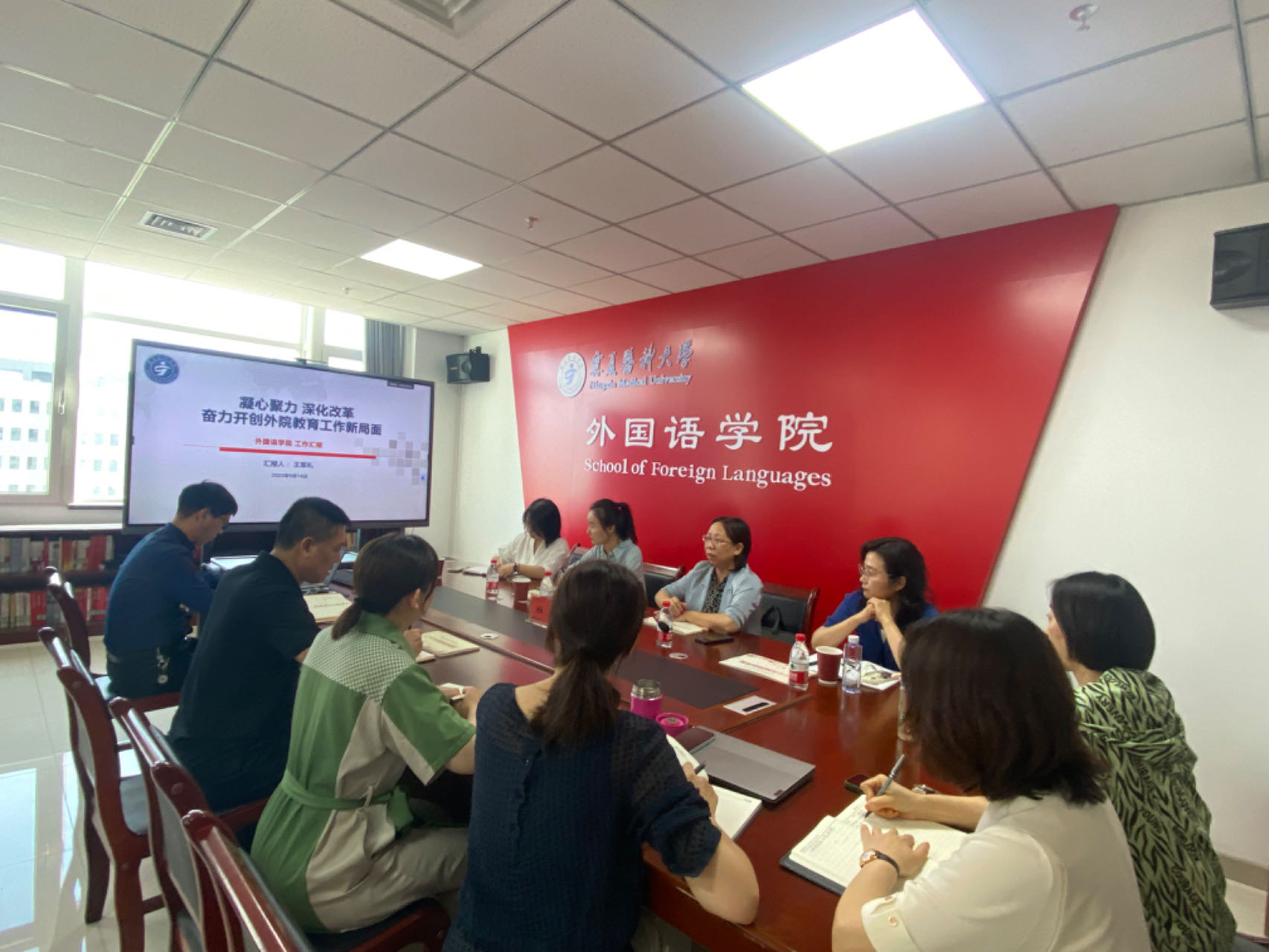 外国语学院负责人就本学期学院重点工作、英语课程建设、学科建设规划、校院综合改革推进情况、二十大精神微课堂等进行了汇报。