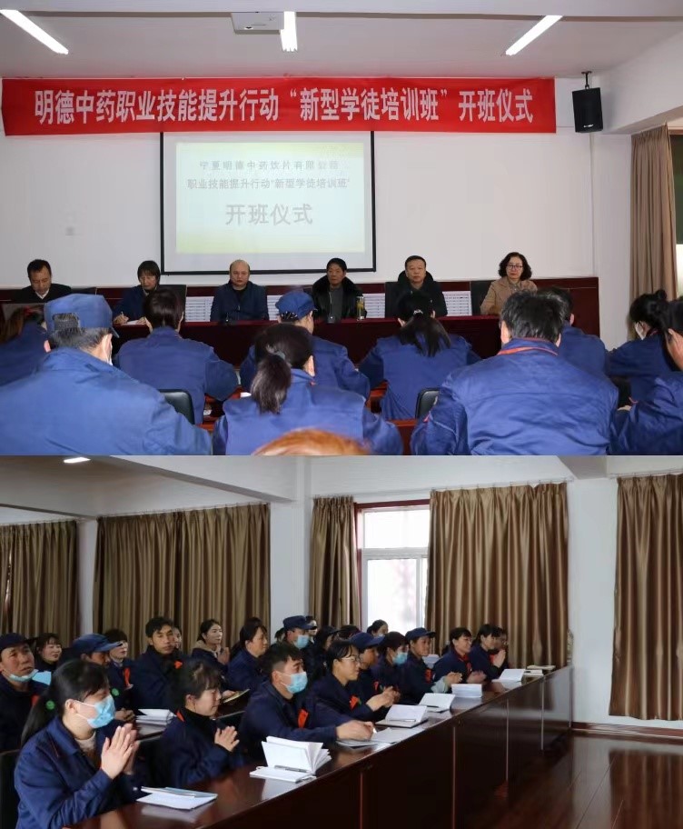 1月10日上午,太阳成集团官方网站少数民族医药重点实验室与宁夏明德中药饮片有限公司联合举办的职业技能提升行动“新型学徒培训班”开班仪式在宁夏明德中药饮片有限公司顺利召开。太阳成集团官方网站少数民族医药重点实验室常务副主任马英锋教授、副主任杜小利教授、明德中药饮片有限公司董事长姜文德、固原市原州区人力资源保障局就业创业和人才服务中心杜鹏飞主任出席此次开班仪式并做了开班致辞。宁夏明德中药公司中层干部、技术骨干及培训学员50余人参加了此次培训。
