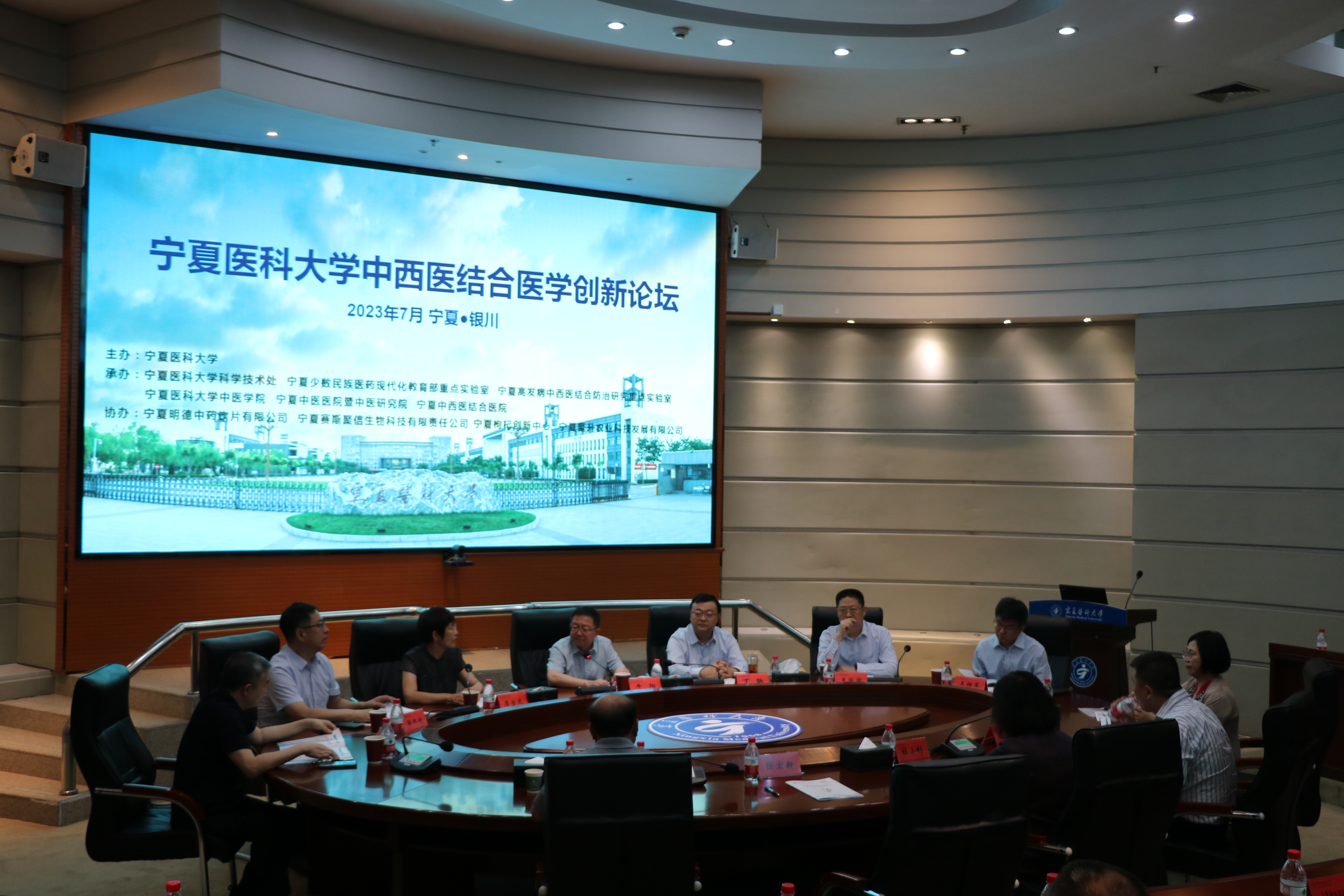 7月8日,由宁夏少数民族医药现代化教育部重点实验室承办的中西医结合医学创新论坛在学校国际会议厅召开。中国工程院院士田金洲,学校党委副书记、重点实验室主任牛阳,学校党委常委、副校长丁聃,来自广州中医药大学、南京中医药大学、上海中医药大学、成都中医药大学等十余所国内知名大学党委书记、校长及研究院所的专家学者出席论坛,会议通过线上线下相结合方式举行。