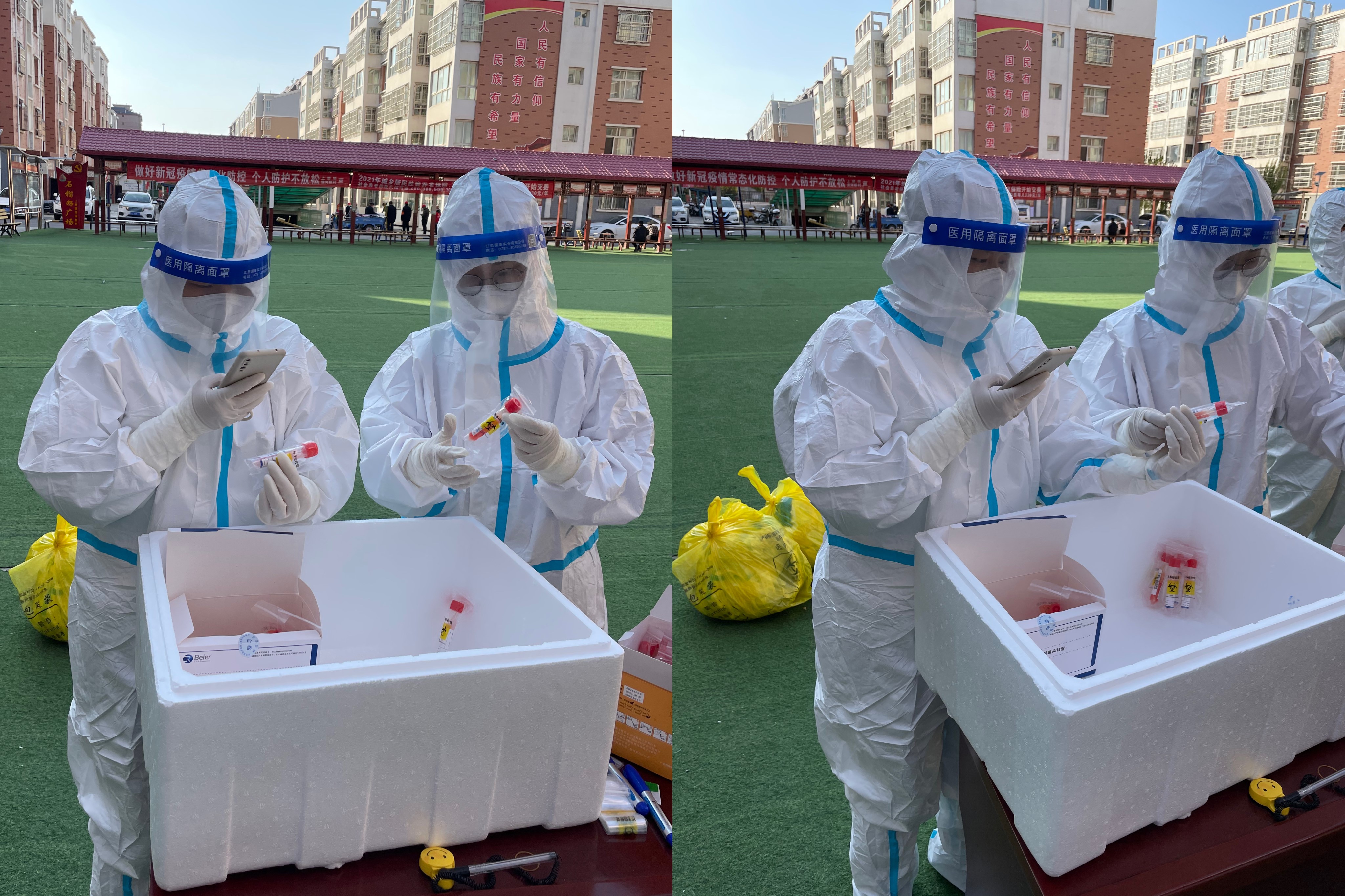 为了确保出征的师生们在做好个人防护的前提下,圆满完成抗疫任务,学校提前对他们进行了穿脱防护服、消杀以及核酸检测采样等“战前”集训。在这场没有硝烟的战争中,实验室的白衣战士们不惧严寒,不畏困难,细心、耐心地为每一位居民做核酸检测,仔细核对试管编码,严格按照规范进行封箱操作,及时转运样本。