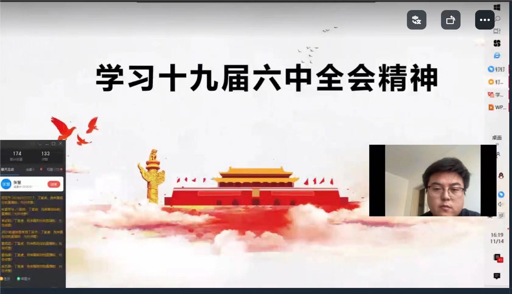 2021年11月8日至11日,中国共产党第十九届中央委员会第六次全体会议于北京召开。受疫情影响,11月14日下午,基础医学院组织本科生在线召开学习党的十九届六中全会精神主题晚点名活动。本次活动由辅导员张慧主持。