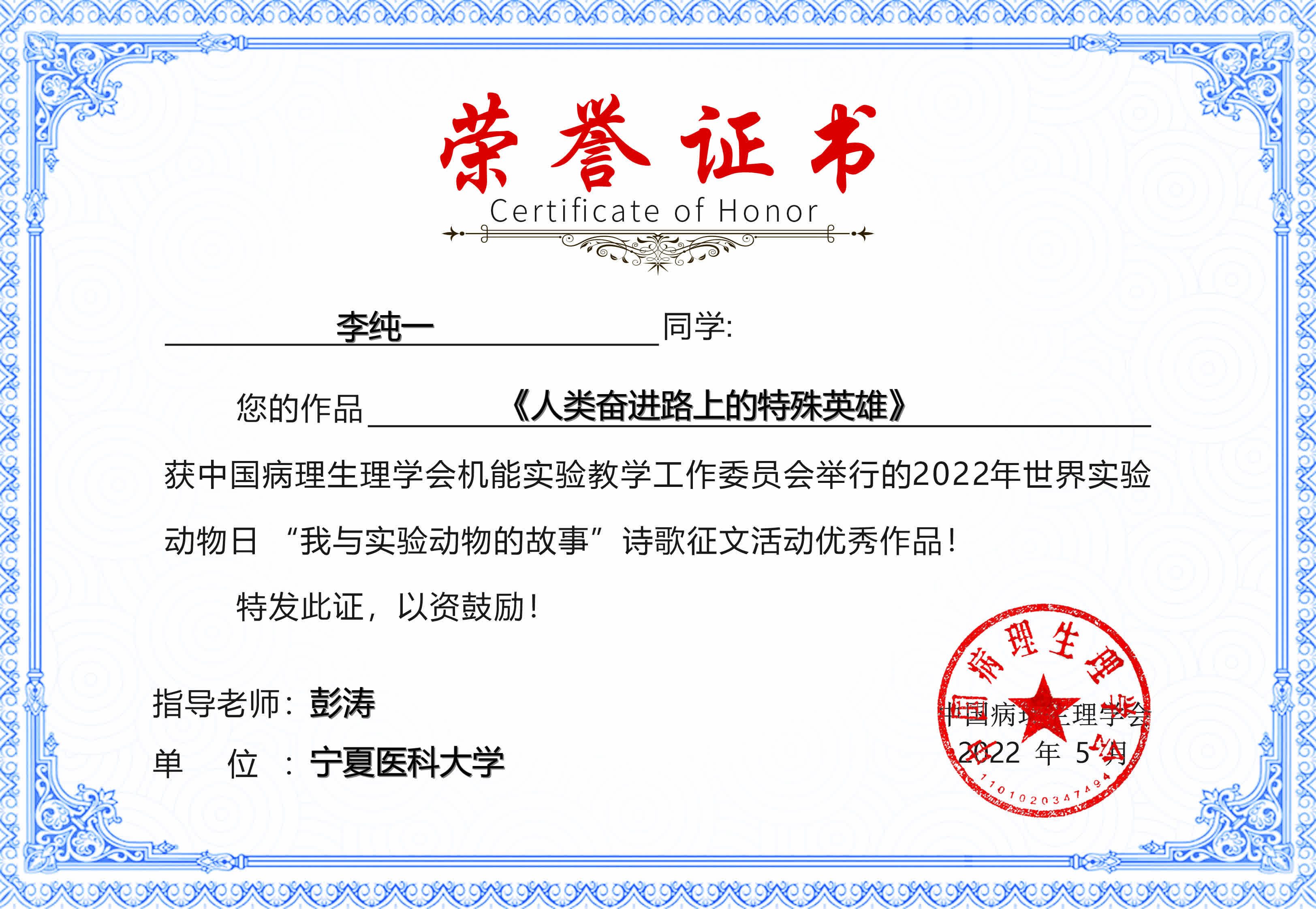 经学校首届“厚生杯”“我与实验动物的故事”诗歌征集评选活动评选推荐的学生作品,在中国病理生理学会机能实验教学工作委员会5月举行的2022年世界实验动物日“我与实验动物的故事”诗歌征文活动中荣获优秀作品。