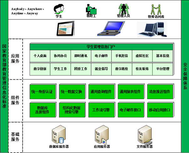 采用先进的J2EE技术架构,基于多层软件构架(即客户层、表示层、业务层、集成层和资源层),采用面向服务(SOA)的思想、WebService和XML等技术整合与集成各种学生管理相关的应用服务,能够为高校学生管理信息化提供先进实用、安全可靠、便于兼容、易于扩展的技术解决方案。技术架构如下: