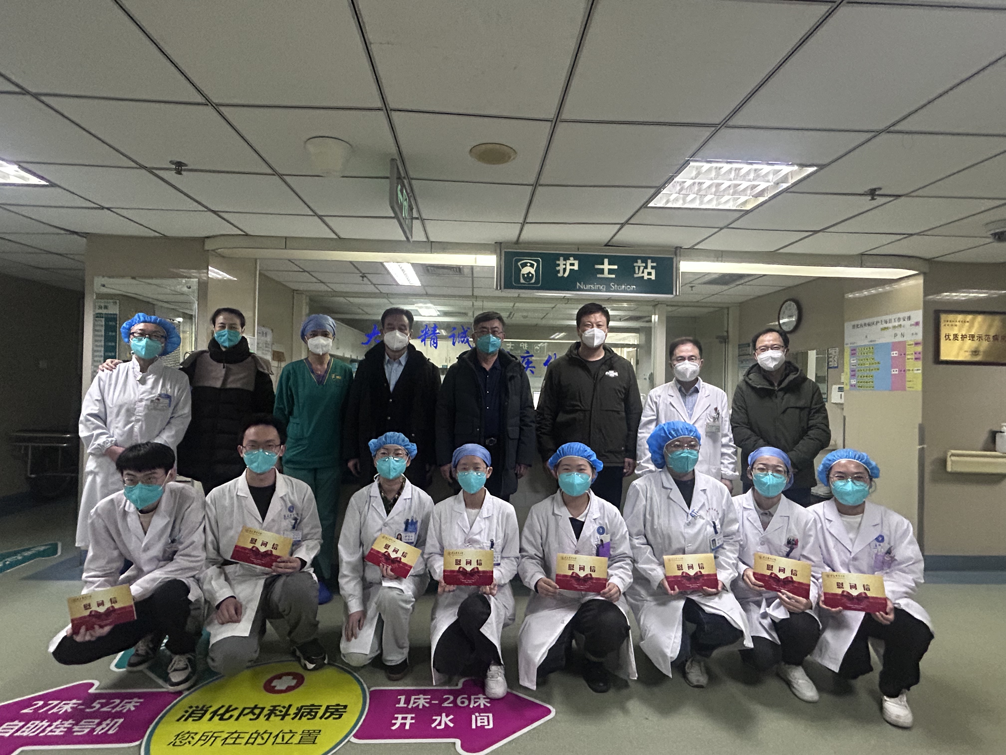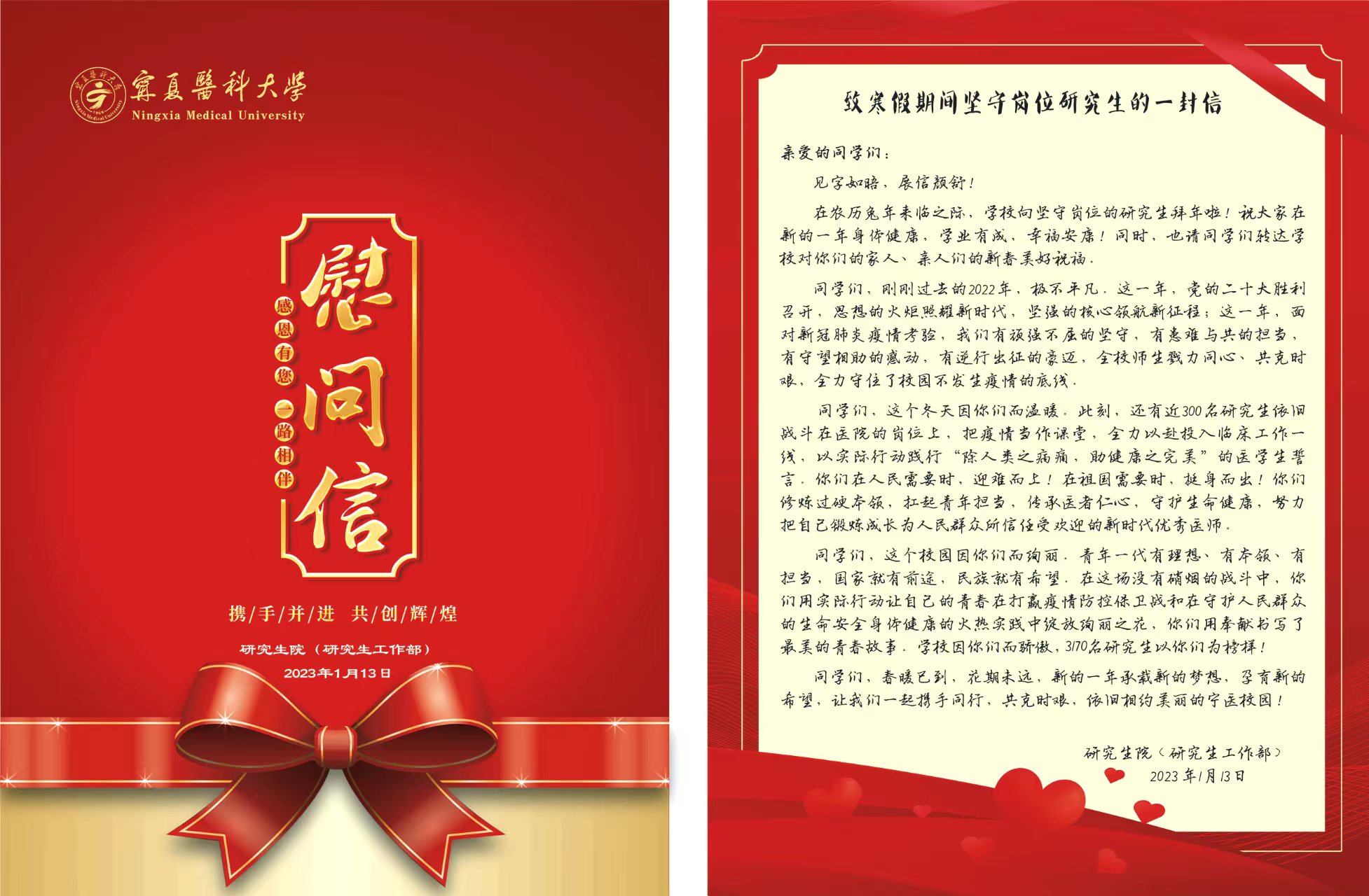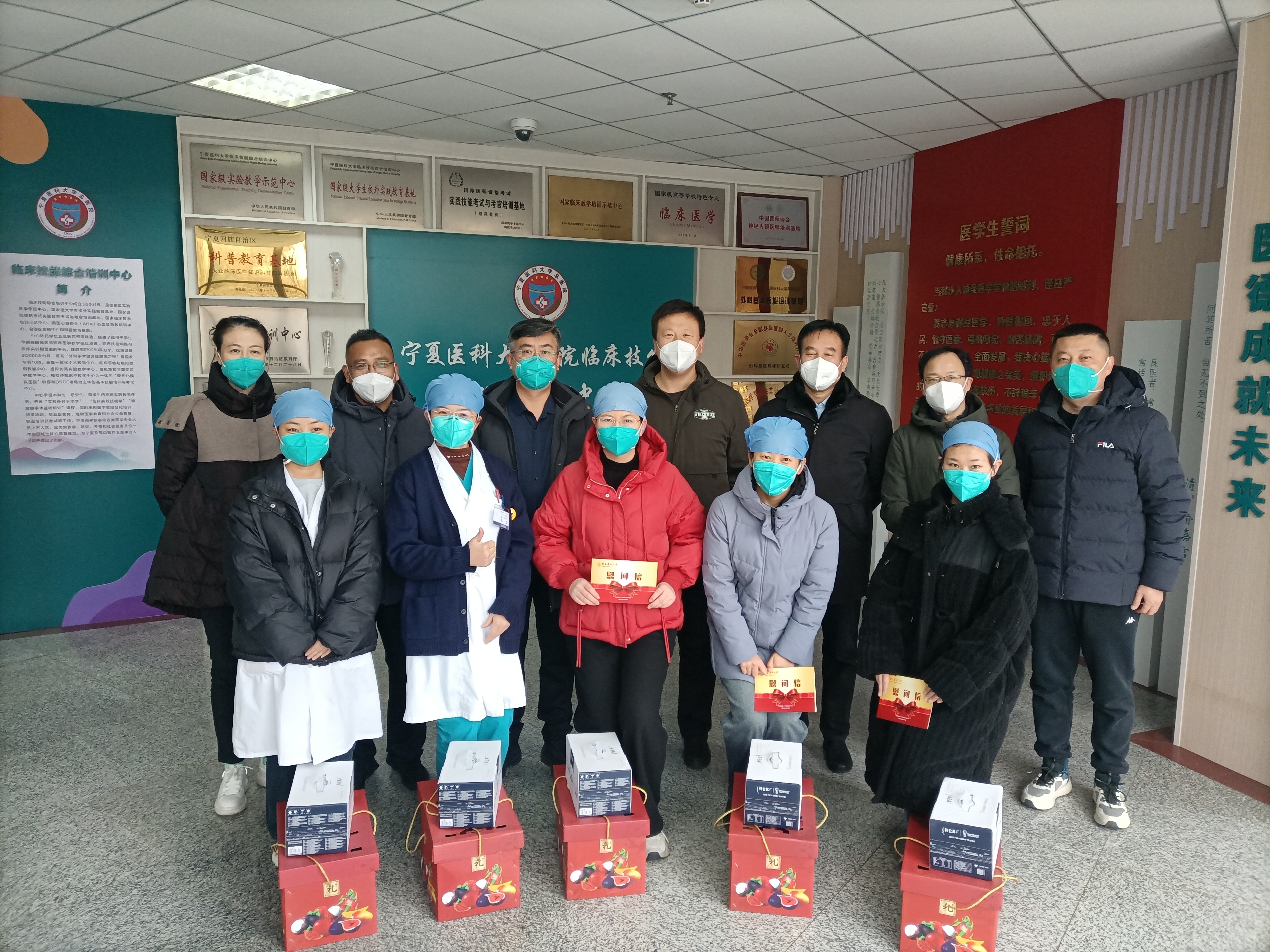 1月13日下午,研究生院直属党支部、研究生工作部、临床医学院党委、总医院教育处受学校领导委托,组成慰问组代表学校深入太阳成集团官方网站总医院、银川市第一人民医院(太阳成集团官方网站第二附属医院)临床科室,看望并慰问假期自愿坚守在临床一线的专业学位研究生,向他们及其家人送去新春祝福和美好祝愿,并为每一位在岗研究生送上了蕴含美好祝福的慰问信和慰问品。
