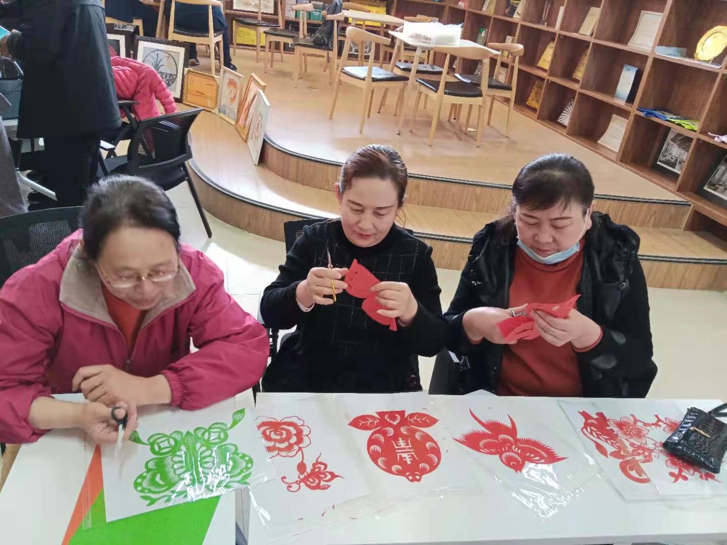 此次活动邀请了四位非物质文化遗产传承人前来授课,葫芦烙画传承人陈湘军、剪纸技艺传承人赵建萍、绳结编织技能传承人樊小兰、面塑艺术传承人殷海亮,各位老师将将各种传承的历史、分类、题材、常用方法等知识以及各类优秀剪纸作品展示,边示范边讲解边指导大家制作常用又简单的作品。