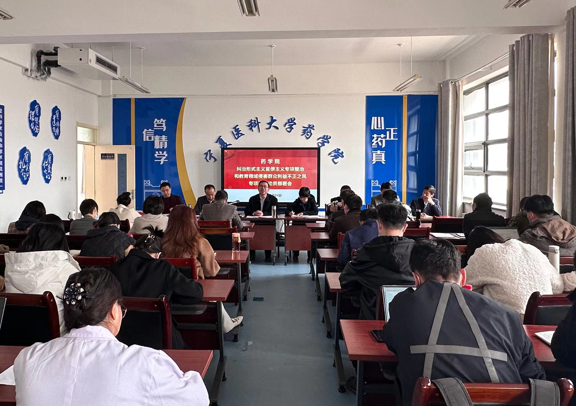 3月24日下午,药学院在润德楼507会议室召开纠治形式主义官僚主义专项整治和教育领域侵害群众利益不正之风专项治理动员部署会,全院教职工参加会议。