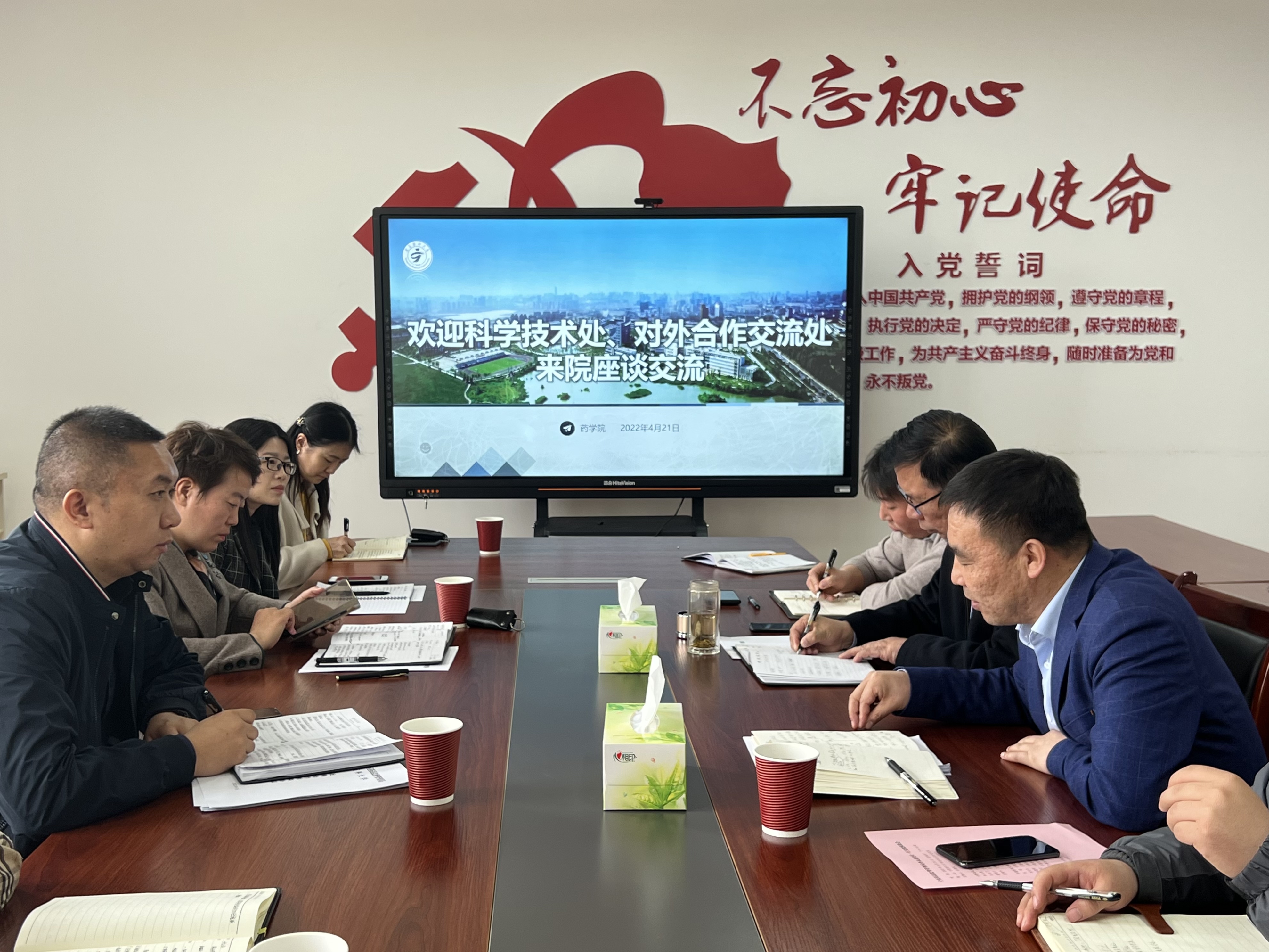 4月21日,学校科学技术处副处长李元杰、对外交流合作处副处长苏明一行到药学院开展科研、对外交流工作专项调研。药学院执行院长余建强、分管科研工作副院长杨建宏、科研管理办公室负责人和教师代表参加座谈。