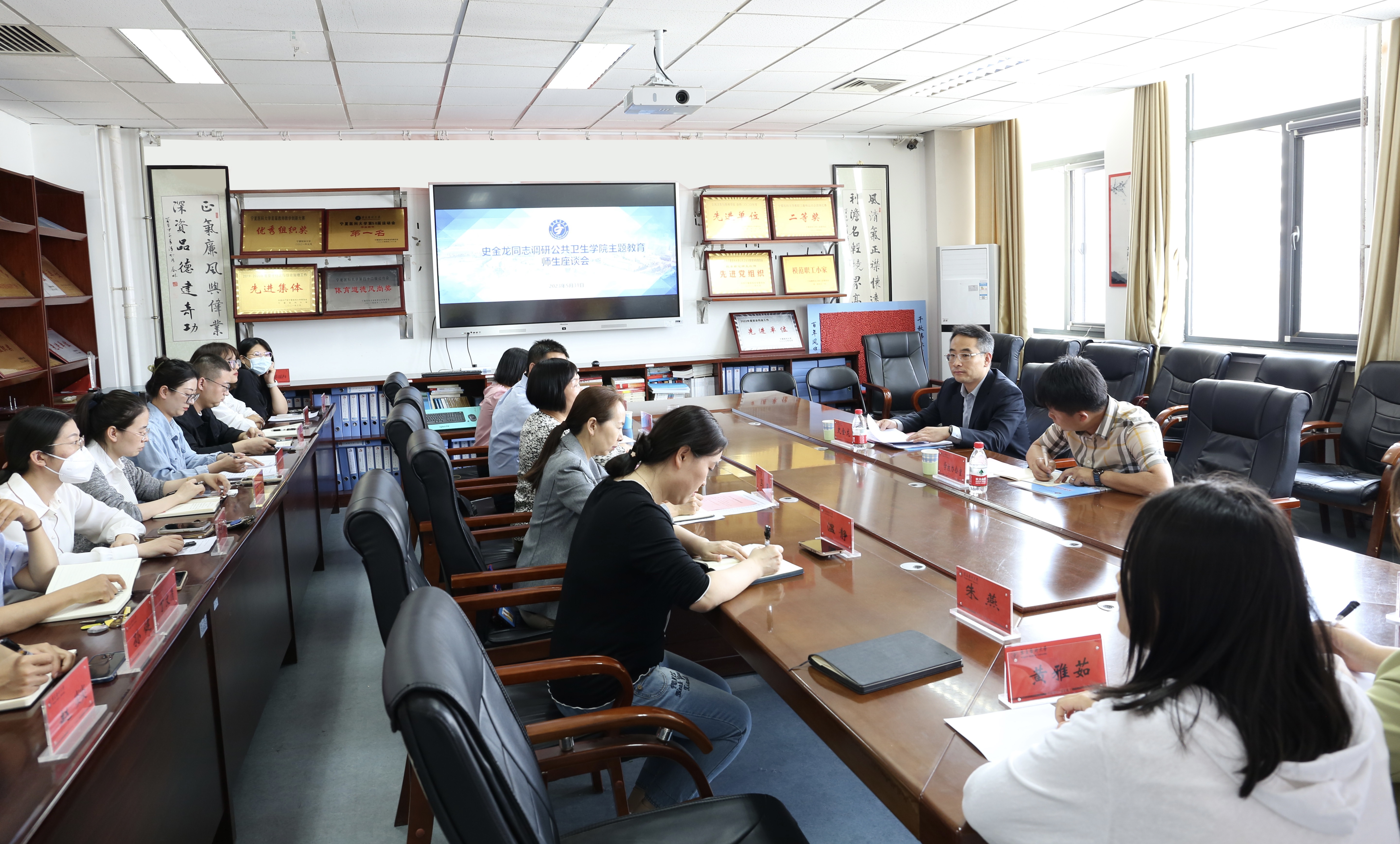 5月31日,学校党委常委、副校长史金龙到公共卫生学院开展主题教育调研并主持召开座谈会,指出主题教育要深化学习教育、立足实际调研、深挖检视整改,切实把主题教育学习成效转化为更好为师生服务、为民办实事、推动高水平公共卫生学院建设的实绩。