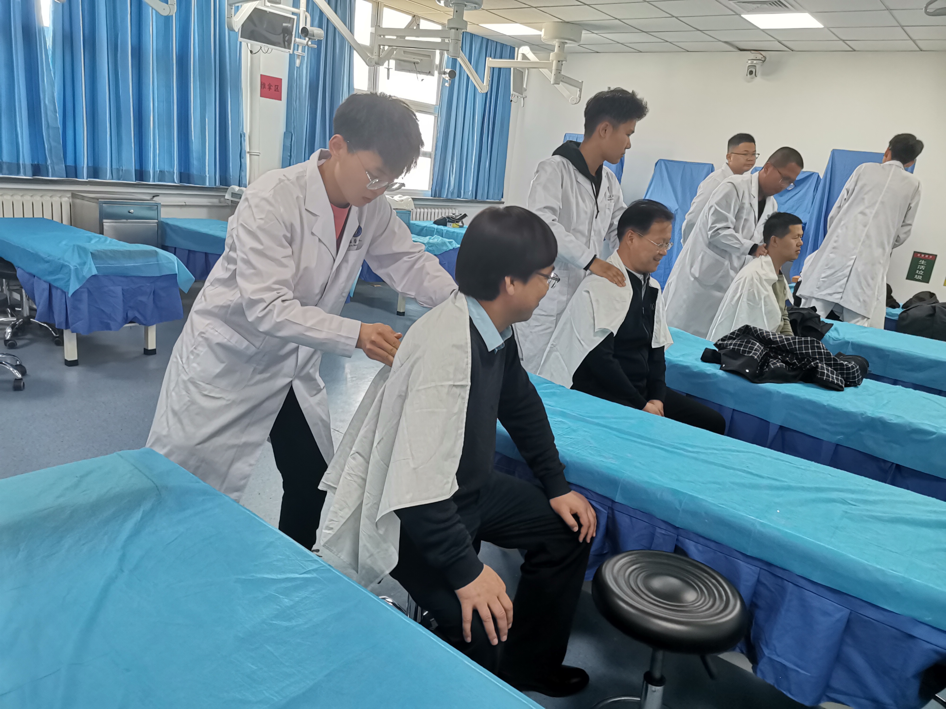 活动现场设置了男女两个诊区,并且将每个诊区细分为分诊区、拔罐区、艾灸区、耳穴区、推拿区、针刺区。共有三十多位老师来到现场体验推拿、拔罐、针灸等中医养生理疗项目。老师们体验之后,对同学们的技能给予了肯定的评价,对义诊活动赞美有加。