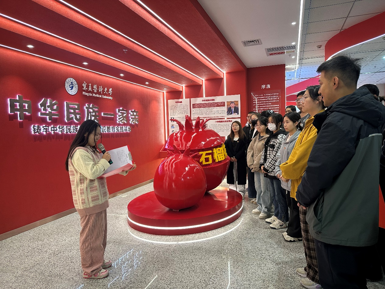 活动中,大家集中学习了习近平总书记在全国民族团结进步表彰大会上的重要讲话精神。在学校“红石榴”宣讲团学生的讲解下,依次参观教育实践基地的六个展厅,深入了解中华民族的历史文化、民族团结进步事业的发展历程以及宁夏地区的民族工作成就。参观结束后,全体党员和团员围坐一堂,就如何在日常学习生活中更好地践行“铸牢中华民族共同体意识”进行交流。