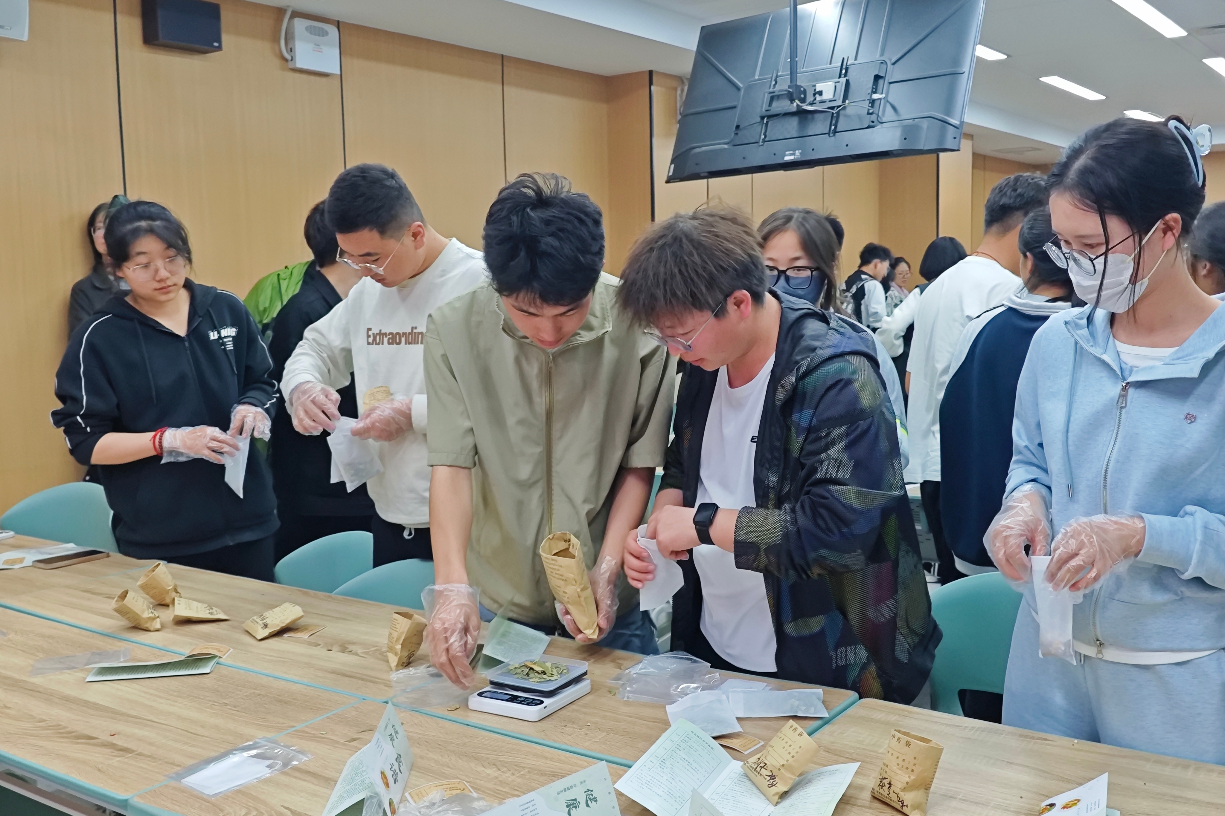 实践环节将活动推向高潮。在专业指导下,同学们化身“养生达人”,亲手调配专属减肥茶。山楂、茯苓、荷叶...十几种中药材在桌上一字排开,称重、搭配、装袋...每个步骤都仪式感满满!药香弥漫中,中医药文化以这样生动有趣的方式,悄然走进了年轻学子的心田。